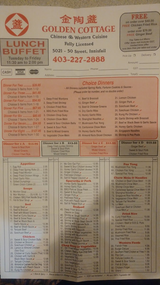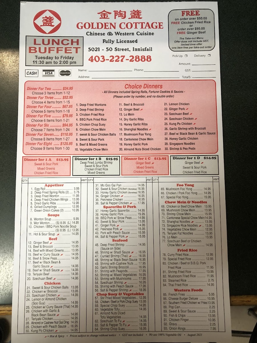 Welcome to Golden Cottage, a hidden gem in Innisfail, Alberta, serving an exceptional fusion of Chinese and Vietnamese cuisine. Nestled at 5021 50 St, this cozy establishment is well-known for its exemplary service and delightful menu offerings that create a warm dining experience.